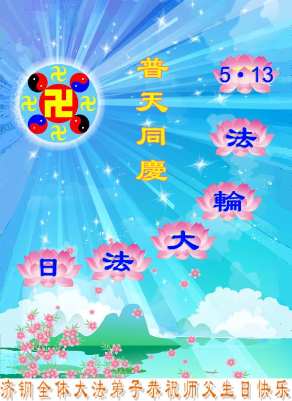 欢庆5.13世界法轮大法日! 感恩师父慈悲救度和细心呵护! 在正法的最后时刻,我们一定丝毫不懈怠和放松自己。要更加严格要求,勇猛精進,修炼如初,助师正法,救度更多众生,完成史前誓愿,跟师父回家! 遂宁市一大法弟子及家人叩拜 二零一三年五月九日。 济钢全体大法弟子恭祝师父生日快乐!