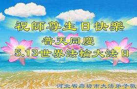 弟子感恩叩拜!师父辛苦了。 河北省廊坊市大法弟子庆祝5.13世界法轮大法日!祝师尊生日快乐!
