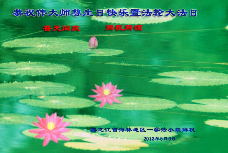 马上就要到世界法轮大法日了,作为大法弟子,向师尊致以最崇高的敬意。 师尊您辛苦了,祝师尊生日快乐! 在正法的最后阶段,弟子会精進,精進再精進,多去人心和执着,做好三件事,救度更多的众生,随师圆满把家还。 在此代表大连市甘井子区5人学法小组,以及其他大法弟子献上两张贺卡,以表达我们心中最美好的祝愿。 黑龙江省牡丹江市海林市学法小组大法弟子恭祝慈悲伟大的师父生日快乐!