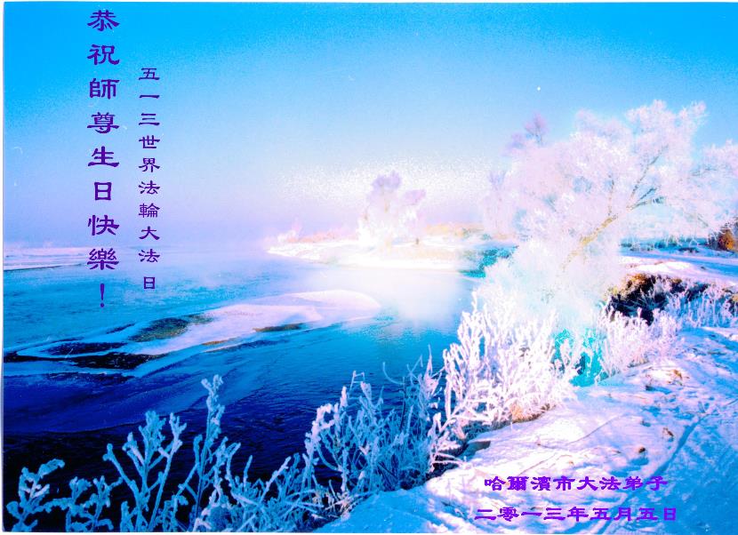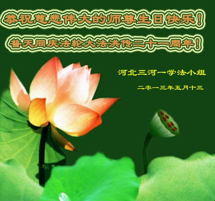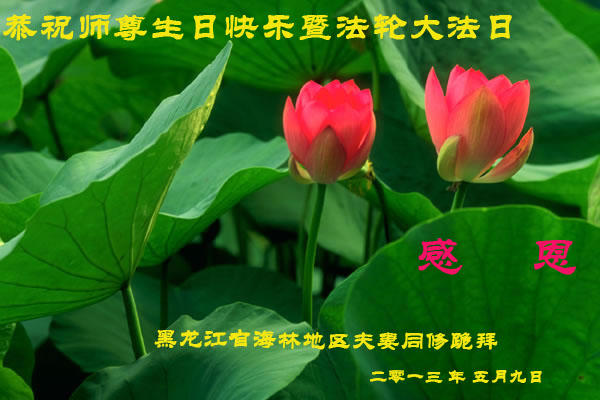 师父的华诞及世界法轮大法日是全宇宙被救度的无量众生都应该无限感恩和欢庆的日子,没有师父的救度就没有众生的未来。河北廊坊地区燕郊全体大法弟子怀着无限感恩的心情恭祝师父生日快乐!在师父的佛恩浩荡下,燕郊大法弟子一直稳步走在助师正法的金光大道上。作为北京的东大门这里离邪恶的最中心天安门只有三十公里,特殊的地理位置也决定了这里的大法弟子更能充分发挥正念的作用直捣邪恶的老巢,更多的救度众生。在正法的最后时刻,燕郊全体大法弟子一定会更加精進,做好师父交待的三件事,救度更多的众生,请师父放心。 河北廊坊地区燕郊全体大法弟子向师父叩首 二零一三年五月 黑龙江佳木斯夫妇大法弟子恭祝师尊生日快乐!恭祝法轮大法洪传二十一周年!