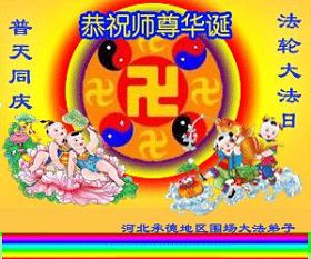 五月十三日就要到了,这一天是世界法轮大法日!是法轮大法弟子最难忘的一天。我们二人学法小组的大法弟子,恭祝:我们伟大的师尊生日快乐!在此,我们也发自内心的向师尊保证:一定做好师父要求的“三件事”,让我们的师尊多一些欣慰,少一些操劳。 河北廊坊三河一学法小组成员 2013年5月9号 河北承德地区围场大法弟子恭贺师尊华诞暨世界法轮大法日!