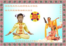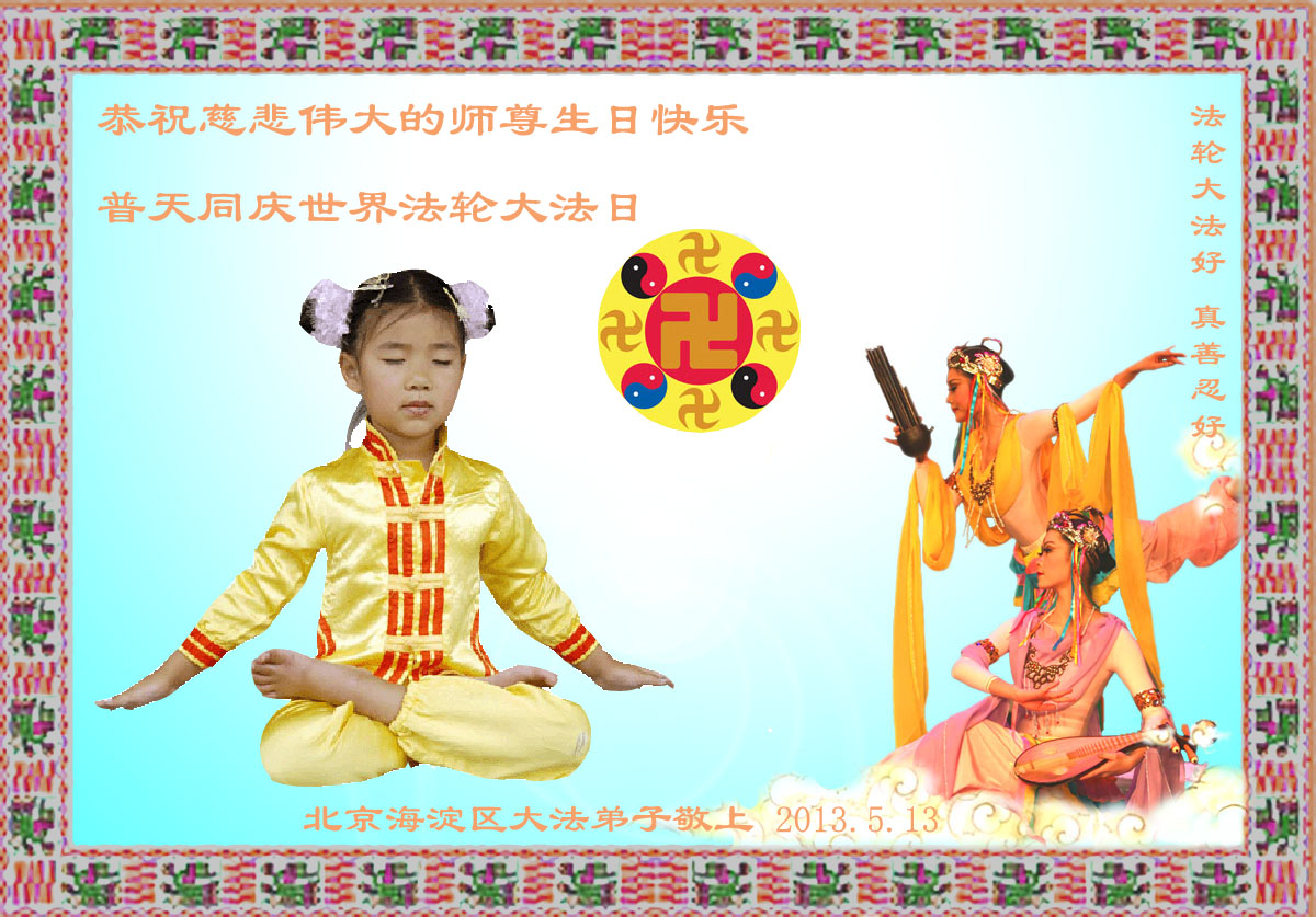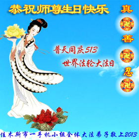 恭祝慈悲伟大的师尊生日快乐! 普天同庆世界法轮大法日! 北京海淀区大法弟子 敬上 2013.5.13 云南一学法小组恭祝世界法轮大法日!