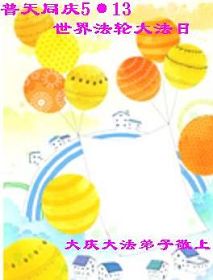 在这普天同庆的日子,弟子感谢师尊慈悲苦度,弟子无以回报,唯有做好三件事,跟师尊回家。 2013年5月3日 黑龙江省大庆大法弟子恭庆5.13世界法轮大法日!