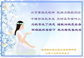 谢师恩 十方同颂师恩浩,神人共唱大法好。 大法洪传乾坤变,荡尽旧尘换新貌。 三字真言正寰宇,法徒修炼师操劳。 讲清真相叫众醒,多救世人上九霄。 二零一三年五月五日 黑龙江省哈尔滨大法弟子恭祝师尊生日快乐暨庆贺世界法轮大法日