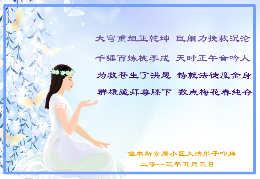 恭祝慈悲伟大的师尊生日快乐! 贺大法洪传二十一周年!唯有精進报师恩!大法弟子手机缘 比学比修添正念 短信彩信飞鸿至 劝善之心于掌间 真相语音救众生 字字句句有善念 不管严寒与酷暑 助师正法了洪愿 佳木斯市一手机小组全体大法弟子 二零一三年五月 黑龙江省佳木斯安居小区大法弟子庆祝世界法轮大法日!