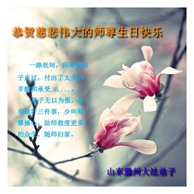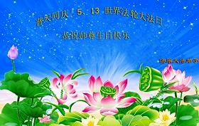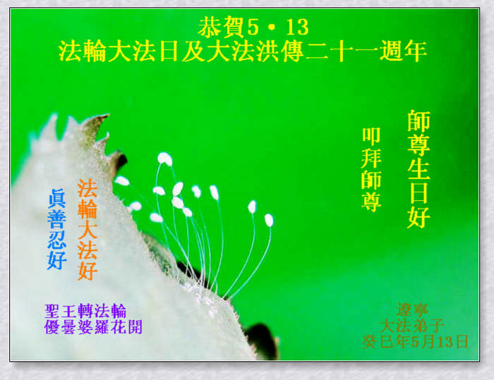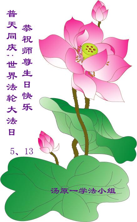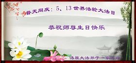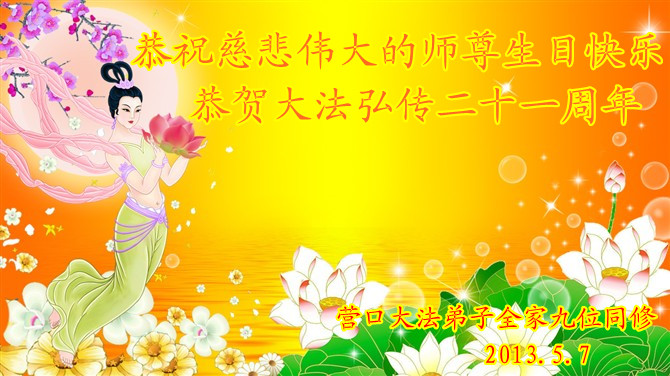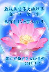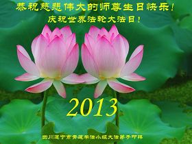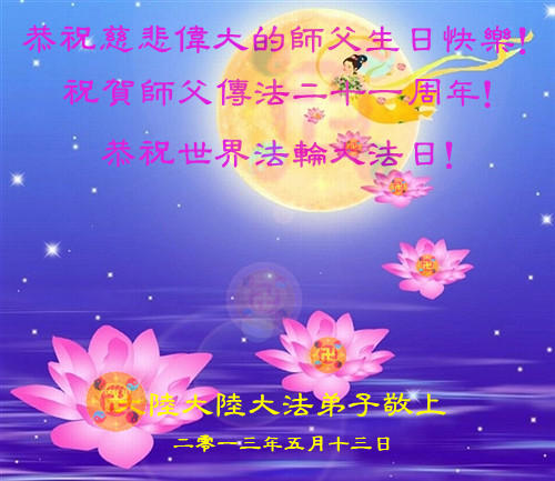 欢庆法轮大法洪传二十一周年之际,我们学法小组全体弟子真诚的向慈悲伟大的师尊问好!感谢恩师多年来对弟子慈悲呵护,弟子们无法用语言表达,只有持之以恒、坚定实修,做好三件事,多救人,完成史前誓愿,回报师恩。再次感恩师尊慈悲救度! 四川遂宁市青莲学法小组大法弟子叩拜 二零一三年五月七日 山东泰安大法弟子恭祝慈悲伟大的师尊生日快乐!