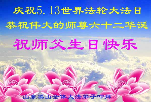 山东梁山大法弟子庆祝5.13世界法轮大法日!恭贺慈悲伟大的师尊六十二华诞!祝师父生日快乐!