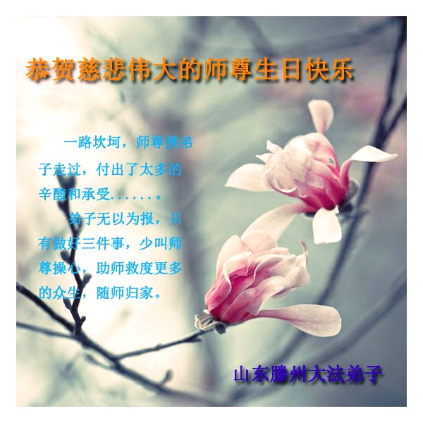 四川邻水县全体大法弟子恭祝慈悲伟大的师尊生日快乐 ,祝贺法轮大法洪传世界二十一周年。值此普天同庆的日子里,弟子们感谢师尊无私的巨大付出,感谢师尊的慈悲苦度!弟子们无以为报,只有走好最后的路,做好三件事,惟愿师尊少一份操劳、惟愿师尊笑! 山东省枣庄市滕州市大法弟子庆祝5.13世界法轮大法日!恭祝师尊生日快乐!