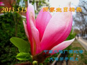 广西田东县全体大法弟子恭祝法轮大法传世二十一周年!恭祝慈悲伟大的师尊生日快乐! 弟子会走好最后的路,做好三件事。感谢师尊慈悲苦度!谢谢师尊!全体大法弟子跪拜师尊! 二零一三年五月八日 广西桂林一大法弟子恭祝师父生日快乐!恭贺世界法轮大法日!