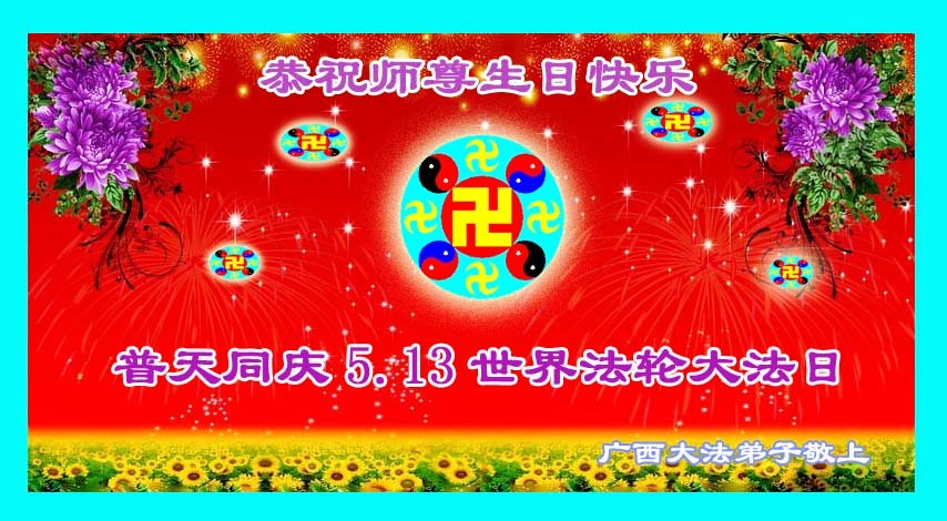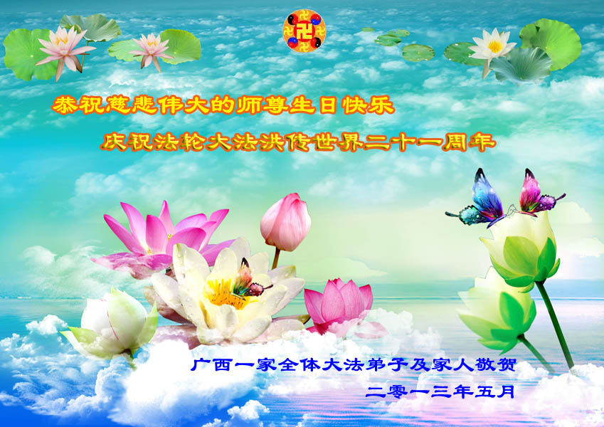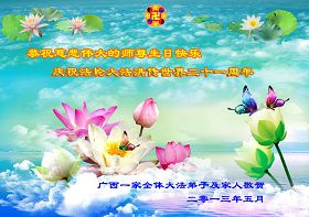 广西一家全体大法弟子及家人恭祝慈悲伟大的师尊生日快乐暨庆祝世界法轮大法日!