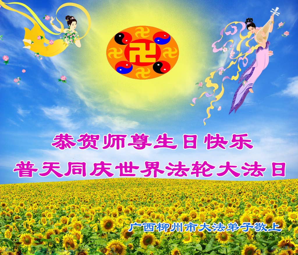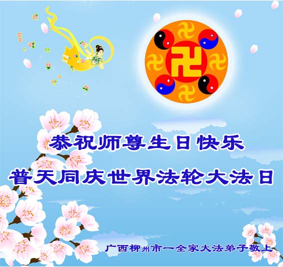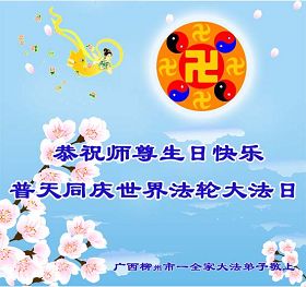 广西柳州市一全家大法弟子恭贺师尊生日快乐!普天同庆世界法轮大法日!