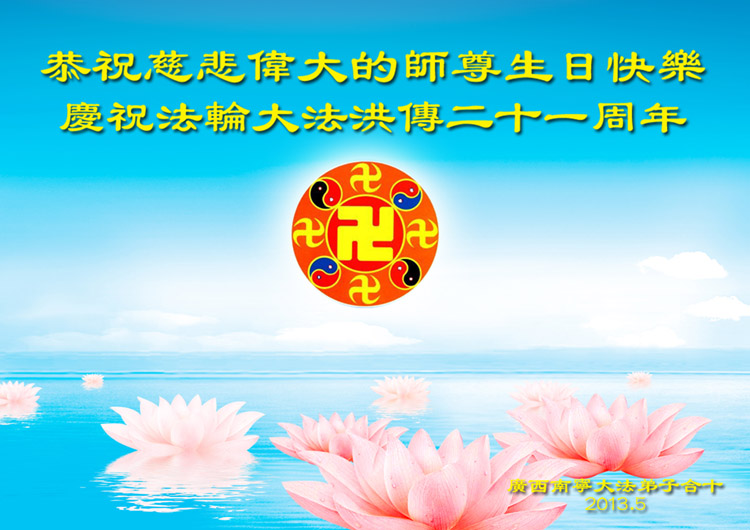 【明慧网二零一三年五月十一日】 广西南宁大法弟子恭祝慈悲伟大的师尊生日快乐!庆祝法轮大法洪传二十一周年!