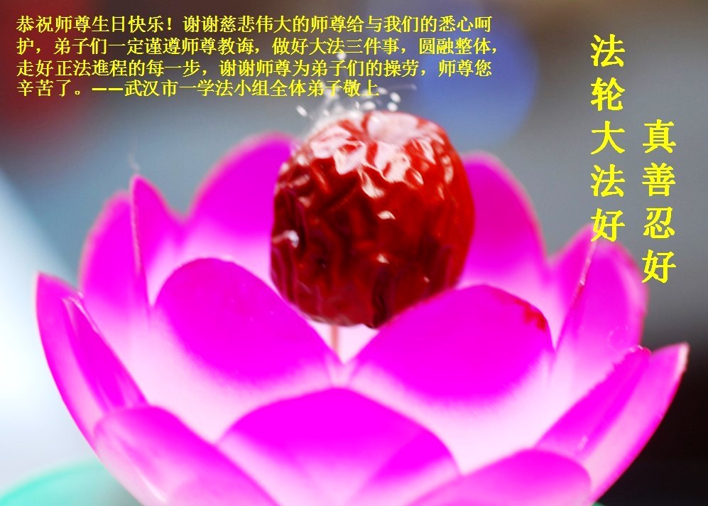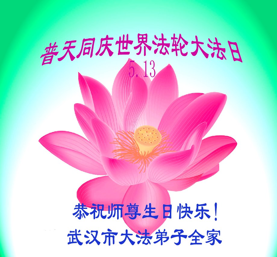湖北省武汉江汉大法弟子恭祝慈悲伟大的师父生日快乐!恭祝法轮大法洪传二十一周年!