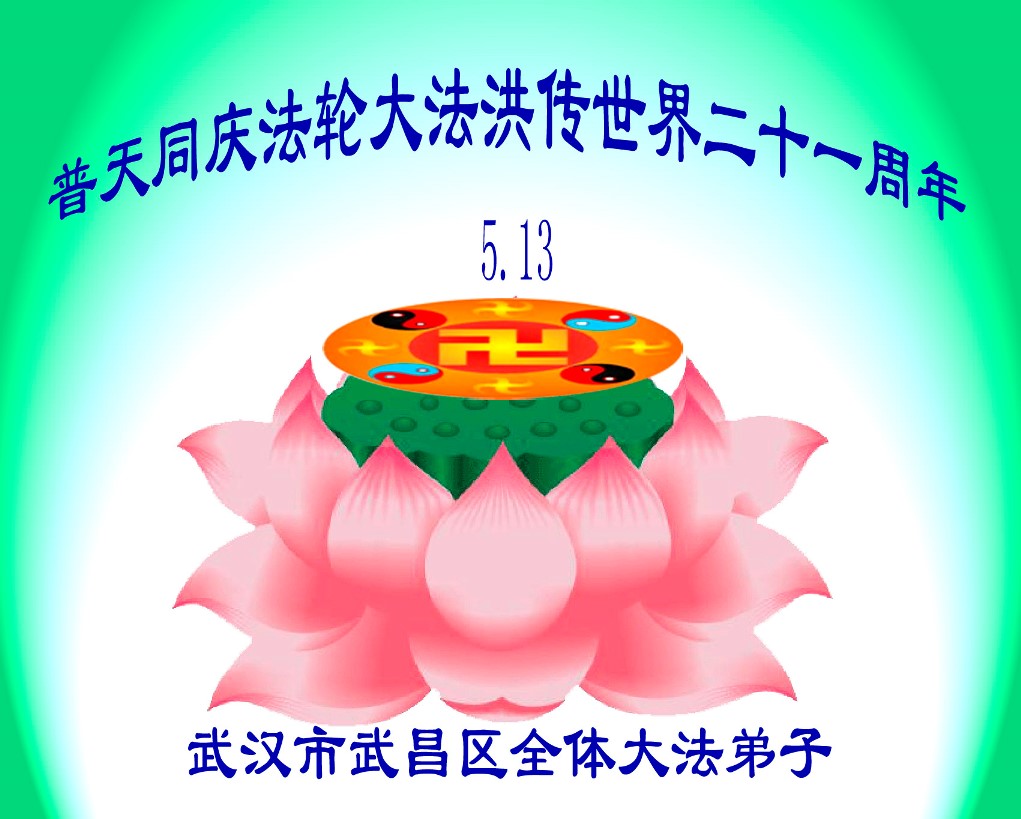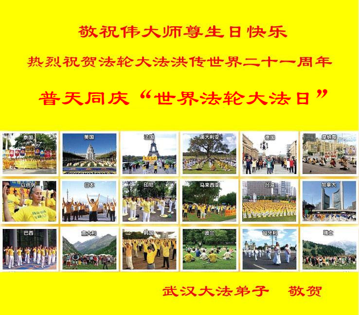 武汉大法弟子恭祝师尊生日快乐! 祝贺法轮大法洪传世界二十一周年! 同庆世界法轮大法日! 武汉大法弟子 湖北省武汉市武昌区学法小组祝贺大法洪传二十一周年并祝伟大的师尊生日快乐!!