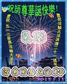 河南省南阳市全体大法弟子恭祝师尊华诞!贺法轮大法洪传世界!普天同庆“世界法轮大法日”! 河南开封市大法弟子恭祝师尊生日快乐!恭祝法轮大法洪传世界二十一周年!