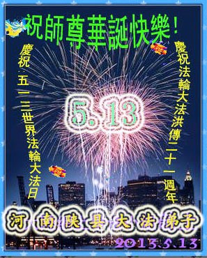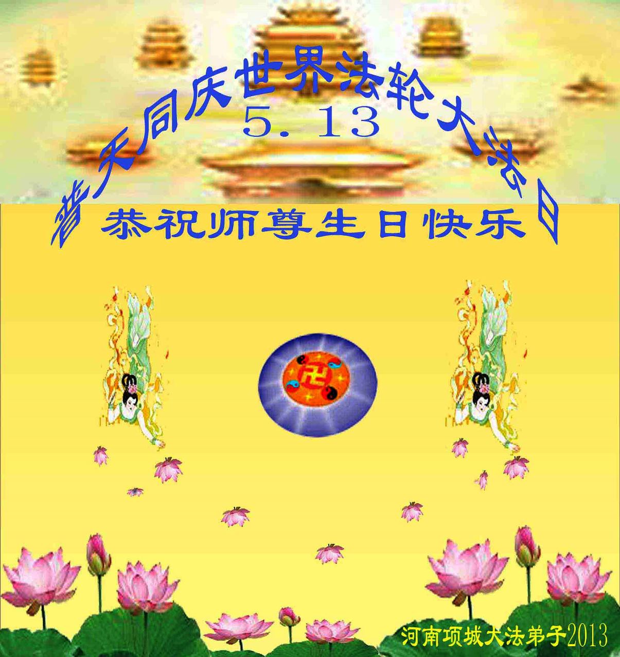 河南陕县大法弟子恭祝师尊华诞!贺法轮大法洪传世界!普天同庆“世界法轮大法日” 2013、5、7 合十 河南许昌学法小组祝师父生日快乐!
