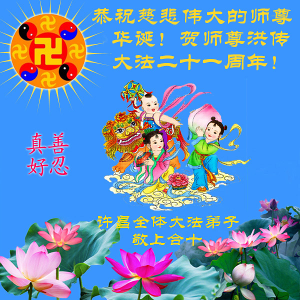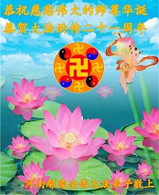 祝师父生日快乐! 河南鄢陵全体大法弟子敬上合十 河南省洛阳大法弟子同祝世界法轮大法日!恭贺大法洪传二十一周年!