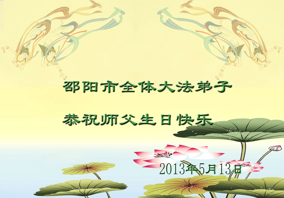 恭祝慈悲伟大的师尊生日快乐!恭贺法轮大法二十一周年! 信师信法,做好三件事,遇事向内找,不辜负师尊的慈悲苦度! 湖南省岳阳市一学法小组全体大法弟子敬上 2013年5月7日 湖南省衡阳市东阳渡镇大法弟子祝贺慈悲的师尊生日快乐!