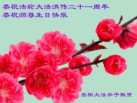 恭贺法轮大法洪传世界二十一周年! 我们感恩师尊的慈悲苦度,无法用语言表达,只愿在师尊的加持下努力精進,多救人,赶上正法進程。 湖南常德石门县全体大法弟子敬上! 湖南安仁全体大法弟子恭祝师父生日快乐!