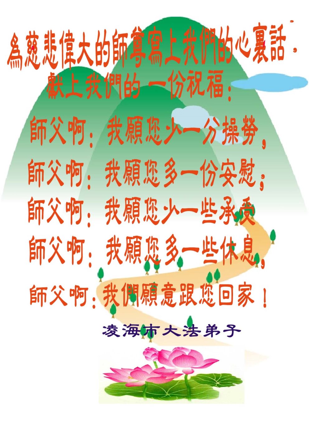 祝师父生日快乐。又到了5.13,我们从心底发出师父您辛苦了。在剩下不多的时间里,我们要勇猛精進,做好三件事,圆满随师还。 辽宁凌海一资料点大法弟子 2013年5月8日 辽宁省锦州凌海市全体大法弟子祝慈悲伟大的师尊生日快乐!