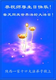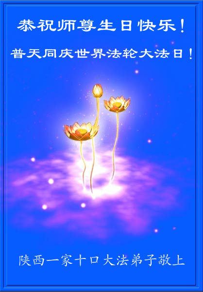 师父,弟子想您了!宝鸡的大法弟子想念师父了!感谢师父十几年来的慈悲苦度,感谢师父对弟子们的一路呵护,在这正法已近尾声之时,宝鸡地区的朵朵小花及所有大法弟子除了万分想念慈悲伟大的师尊之外,唯有更加精進,做好师父交给的三件事来回报师恩! 陕西省汉中市城固县大法弟子恭祝伟大的师尊生日快乐!
