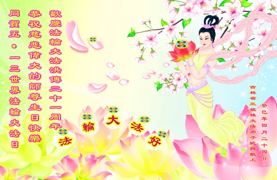 二零一三年五月十三日,我们法轮大法弟子又迎来了慈悲伟大的师尊六十二岁寿诞!大法轮大法传世二十一周年!世界法轮大法日! 在这普天同庆的时刻,我们三姐妹怀着无比感恩的心双手合十!恭祝慈悲伟大的师尊生日快乐! 师尊您辛苦了!我们要在这有限的时间里,多学法,向内找,修好自己,做好三件事,勇猛精進多救人,完成我们的史前大愿,不辜负师尊的慈悲苦度,圆满随师回家园。 吉林省三姐妹二零一三年五月八日跪拜敬上 同时代表被非法关押在监狱的外甥同修恭祝慈悲伟大的师尊生日快乐! 被非法关押在马三家三大队的所有大法弟子祝师父生日快乐!