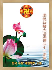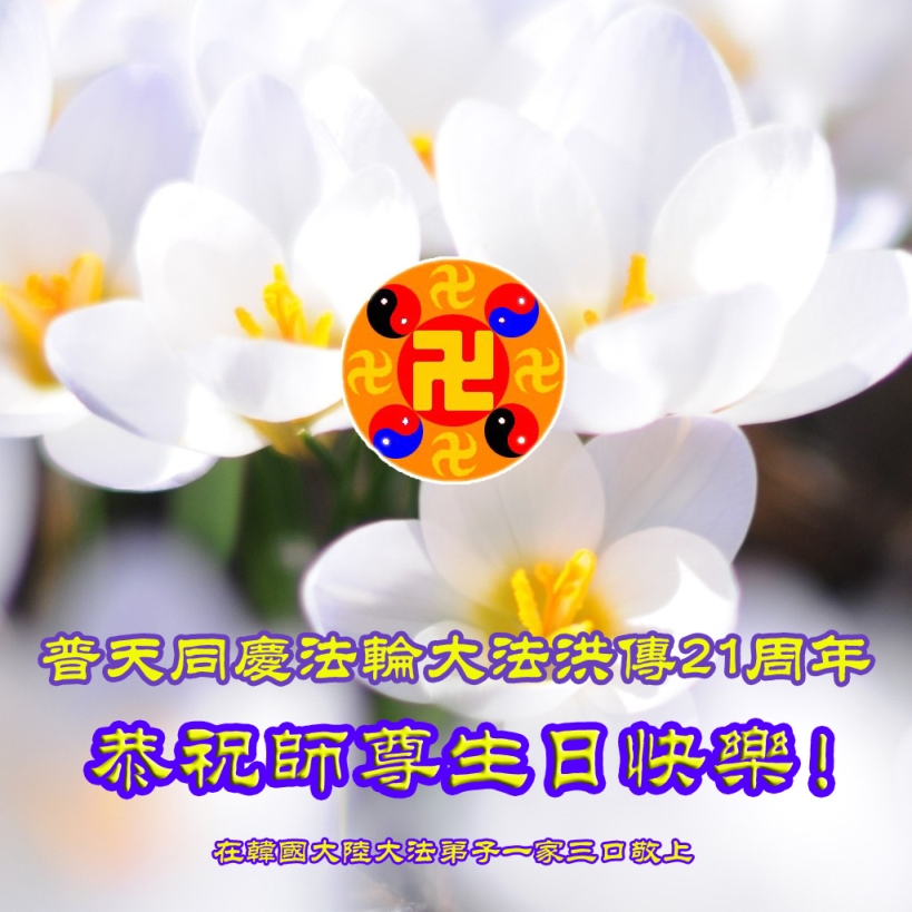 在5.13、师尊华诞暨世界法轮大法日来临之际,在韩国的朝鲜族大法弟子祝慈悲伟大的师尊圣诞快乐!祝法轮大法洪传二十一周年! 在今后的时间里,弟子会遵照师尊的教导,珍惜每一分、每一秒,扎扎实实做好三件事。每一思、每一念都用大法来衡量,要正念不要人心。 弟子会努力从狭隘的人的观念和理中跳出来,用大法来衡量周围的一切,真正为法负责、为同修负责、为众生负责、也为自己负责,真正做到神在人间。 千言万语,只能以更加精進回报师恩。 韩国安山市全体大法弟子恭祝慈悲伟大的师尊生日快乐!