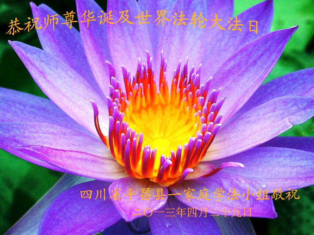 在第21个世界法轮大法日到来之际,恭祝慈悲、伟大的师尊生日快乐! 我们会更加精進做好三件事,救度更多众生,圆满随师还。 辽宁鞍山市岫岩大法弟子 2013年5月8日 四川达州市通川区一大法弟子恭祝慈悲伟大的师尊生日快乐!恭贺5.13世界法轮大法日!