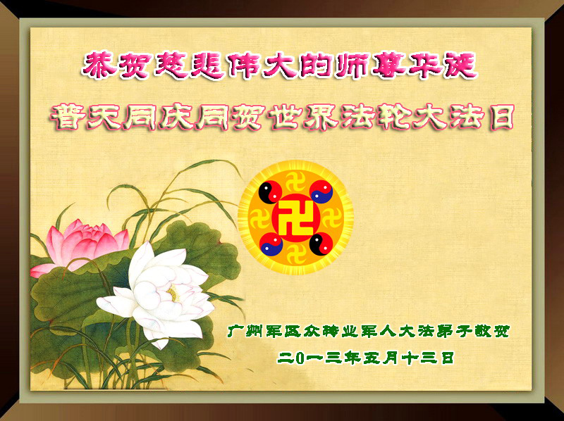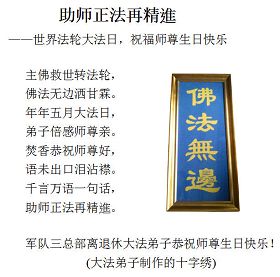 助师正法再精進 ——世界法轮大法日,祝福师尊生日快乐 主佛救世转法轮, 佛法无边洒甘霖。 年年五月大法日, 弟子倍感师尊亲。 焚香恭祝师尊好, 语未出口泪沾襟。 千言万语一句话, 助师正法再精進。 广东省广州军区众转业军人大法弟子恭贺师尊华诞!普天同庆同贺世界法轮大法日!