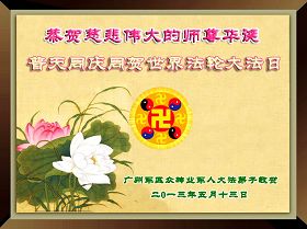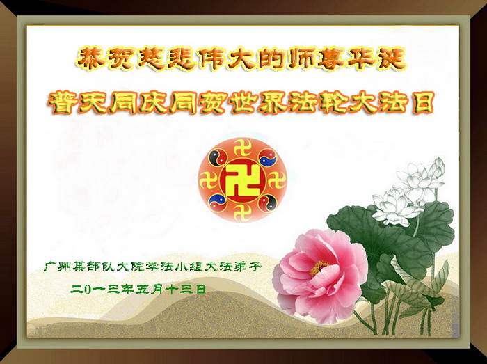 恭祝师父生日快乐! 让我们在无比伟大的师尊指引下,走好、走正最后这段救度世人、成就大法弟子之路!越最后越精進! 中国大陆军中教育界全体大法弟子敬上 2013年5月6日 广东省广州某部队大院学法小组大法弟子恭贺慈悲伟大的师尊华诞!普天同庆同贺世界法轮大法日!