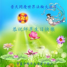 我是一名新得法的法轮大法学员,是法轮大法的无边法理给我指明了前進的方向,给了我战胜困难的勇气和力量。在五一三这喜庆的日子来临之际,在师尊生日到来之际,衷心的祝愿师尊生日快乐! 哈尔滨市阿城区大法弟子及姐姐、女儿和刚得法的母亲恭祝慈悲伟大的师尊生日快乐
