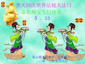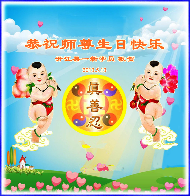 恭祝慈悲伟大的师尊六十二华诞! 恭贺法轮大法洪传二十一周年! 恭贺世界法轮大法日十四周年! 谢师恩 师恩浩荡慈悲伟大 正大穹宇救度苍生 佛光普照万物更新 普天同庆叩谢师恩 叩拜师尊 合十 成都奇缘学法小组大法弟子和新学员敬上 二零一三年五月八日 大陆新弟子恭祝师尊生日快乐!