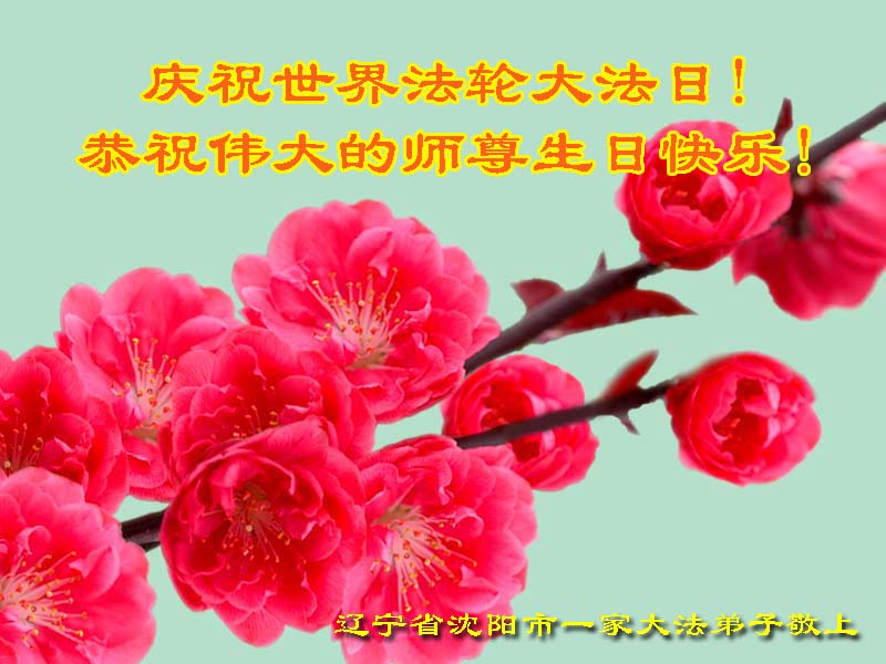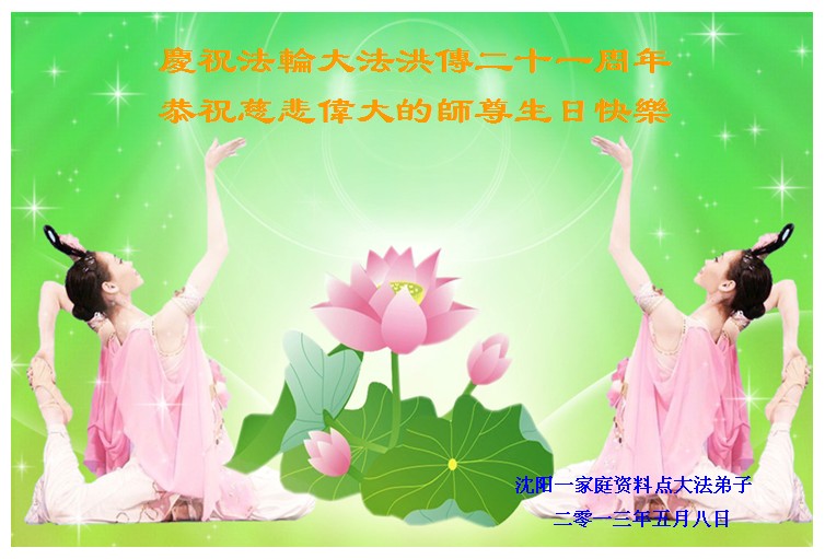 感谢师父慈悲救度之恩。我们全家人沐浴在法轮大法的佛光普照之中,身心健康、宁静、祥和。只有身在其中的人才能感受恩师的伟大慈悲。法轮大法是救人的天法。望天下人早日了解真相、认同法轮大法好,才能选择生命的美好未来。 值此5.13法轮大法洪传二十一周年之际,辽宁省沈阳一学法小组全体大法弟子恭祝师父生日快乐!