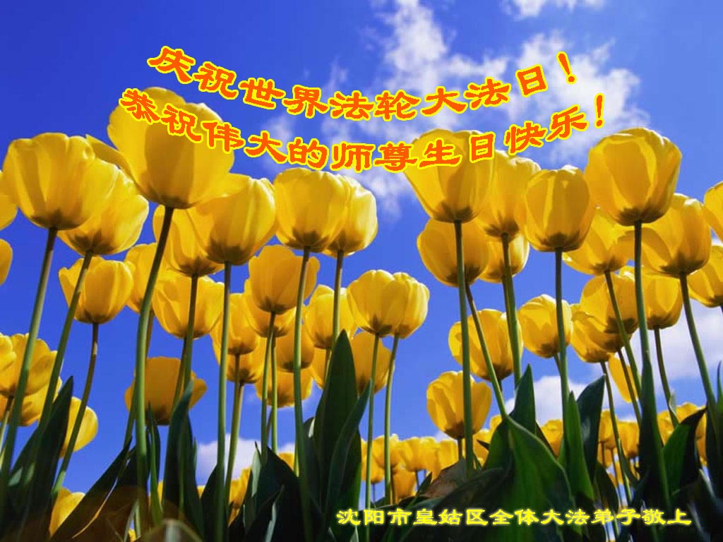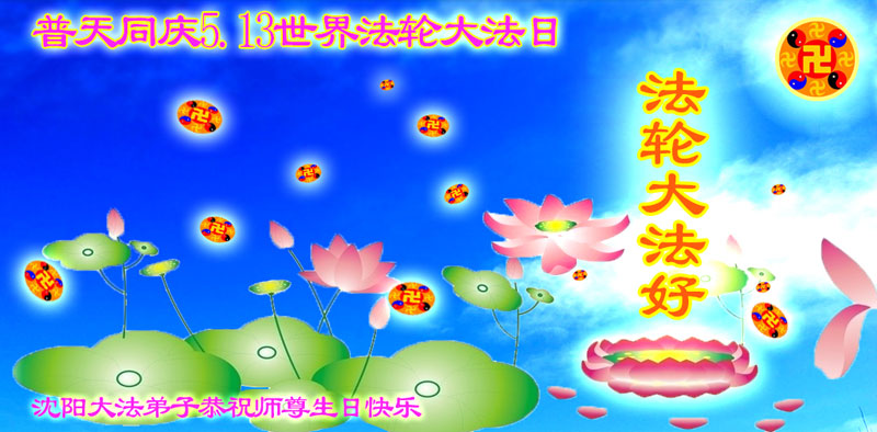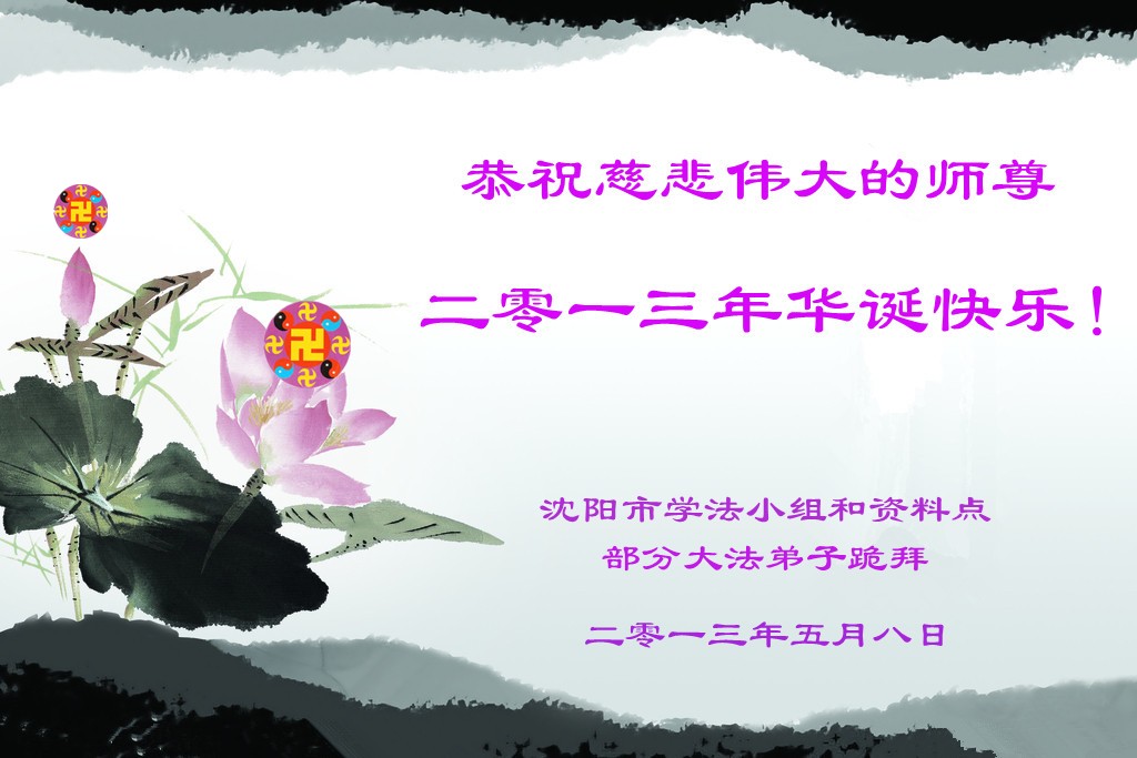 值此法轮大法日暨师尊圣诞之际,沈阳大法弟子恭祝师尊圣诞,感谢师尊慈悲救度! 随着正法形势的推進,世人也越来越觉醒,大法弟子也越来越成熟。魔难面前,都能够正念对待,形成金刚不破的整体,清除旧势力的一切阻碍。在师尊大法指导下,我们会越走越稳,积极救度众生,做好三件事,更好的完成自己的责任和使命,不负师尊为众生的付出,不负师尊的谆谆教诲,不负师尊的慈悲苦度。 颂师 佛有亿亿生 大洪在劫中 主佛现苍穹 一念乾坤更 洪宇除旧尘 唯敬师洪恩 圣莲满天庭 世界万物丰 沈阳大法弟子敬上 二零一三年五月 辽宁省沈阳大法弟子恭祝师尊生日快乐!普天同庆世界大法日!