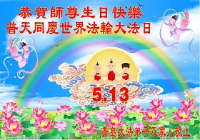 恭祝法轮大法传世二十一周年!祝贺5.13世界法轮大法日!叩拜师尊!师尊辛苦了! 感谢师尊慈悲救度,弟子唯有遵照师尊的教诲做好三件事,唯有精進再精進,踏踏实实修炼,多救人!敬请师尊放心!我们一定听师尊的话,圆满随师还! 恭祝慈悲伟大的师尊生日快乐!普天同庆“5.13”世界大法日!