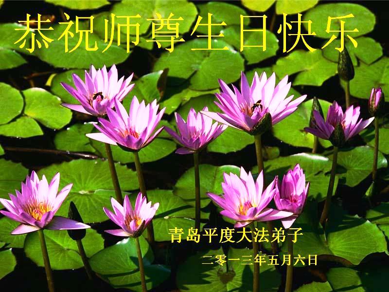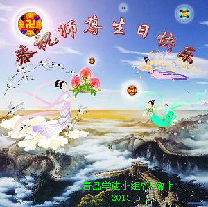 慈悲伟大的师尊:在您的生日到来之日,青岛学法小组全体大法弟子恭祝您生日快乐!万事如意!请您放心,我们一定严肃、严格遵照您的教诲,扎扎实实的做好三件事,不负您的慈悲苦度! 佛恩浩荡正苍穹, 慈悲苦度广众生, 师尊导航法指路, 多少艰辛您担承。 青岛学法小组全体大法弟子敬上! 2013年5月9日 山东省青岛大法弟子及家人恭贺师尊生日快乐!普天同庆世界法轮大法日!