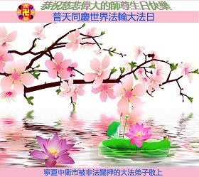 我代表我们全家及被非法关押在狱中的丈夫向慈悲伟大的师父问好,祝师父生日快乐!在修炼的这条路上走的磕磕绊绊,愧对师父的慈悲苦度,每当摔倒了,师父都不放弃不争气的弟子总是鼓励我继续爬起来接着往前走。师尊的佛恩浩荡弟子无以言表,唯有走好以后的路,让师尊少一份操劳。 从北京女子监狱和劳教所坚定走过来的大法弟子恭祝慈悲伟大的师尊生日快乐!庆贺世界法轮大法日!