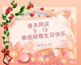弟子永远不忘师父的苦度,做好三件事,报答师父苦度之恩。 江苏淮安大法弟子恭祝慈悲伟大的师尊生日快乐!热烈祝贺大法洪传二十一周年!庆祝世界法轮大法日!