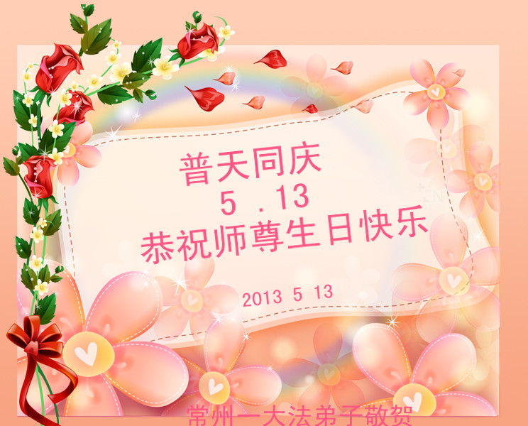 庆祝5.13世界法轮大法日! 师尊,弟子想念您!弟子很想做好一切事。感恩师尊对弟子的一路呵护,慈悲救度。弟子一定修去人心,修去执着,真正实修,正念正行,做好三件事,多救人,做一个合格的大法弟子,随师尊回家园。 江苏省苏州市张家港市大法弟子 江苏二人学法小组恭祝慈悲伟大的师尊生日快乐!