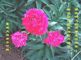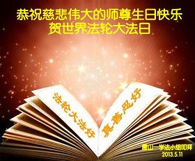 四月二十六日,师父发了《作恶者自負》的新经文,帮助弟子去人心。五月十三日是世界法轮大法日,又是师父的华诞,也是师父传法正法二十一周年纪念日!实是喜事连连啦!在此,我代表我们学法小组及全家向师尊问好!我们每一个都有在师父慈悲呵护下,说不完的神奇故事,特在此真心实意谢谢慈悲伟大的师尊! 合十 四川德阳大法弟子敬上 二零一三年五月十一日 四川省成都市彭州市大法弟子祝贺师尊生日快乐!庆祝5.13法轮大法日暨大法洪传21周年!