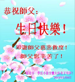 【明慧网二零一三年五月十三日】 吉林省延边州延吉市一学法小组全体大法弟子恭祝师父生日快乐!