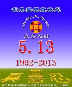 历经风雨无阻 过了一年又一年 又迎来了五一三 世界法轮大法日 二十一年正法路 众徒儿与师同在 今天我们快乐 我们欢呼 我们与天同庆 伟大的师尊您好 祝您生日快乐 二零一三年五月五日 吉林省长春市德惠市大法弟子恭贺第十四届世界法轮大法日!