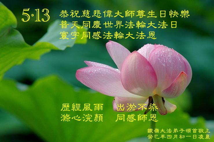 四川省宜宾市翠屏区一教师大法弟子敬祝慈悲伟大的师尊生日快乐,同贺“5.13”世界法轮大法日暨法轮大法洪传二十一周年! 师父您好!自一九九八年底得法以来,因为有师父您的一路呵护,弟子才走到了今天。当我一度迷失很深,无力回头绝望无比之时,是您又一次将我从地狱除名,是您再一次将我捞起洗净!师父您告诉弟子:“摔倒了别趴着,赶快起来!”,(《法轮大法 二零零三年元宵节讲法》)我艰难的站起来了,继续走在布满“荆棘”却充满了阳光的修炼路上。所有的语言都无法表达弟子对您的感恩,所有的文字都是那么苍白无力,弟子深深知道,唯有精進、精進、再精進才是能报答您的最强音! 师父您说:“师徒不讲情 佛恩化天地”,(《洪吟二》〈师徒恩〉)这洪穹中的一切,每个大法徒的心田,因为师父的恩泽而充满了希望与光明! 在这正法的最后时刻,师父啊,弟子一定努力做好“三件事”,不松懈精進的意志,跟您回家! 弟子向师父合十、跪拜! 癸巳年三月廿四日 一老年大法弟子的家属敬祝李大师生日快乐!