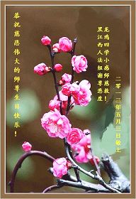 黑龙江省鸡西市密山市八五七农场整体大法弟子。 黑龙江省鸡西市密山市一大法弟子跪拜师父生日快乐!祝贺大法洪传世界二十一周年!