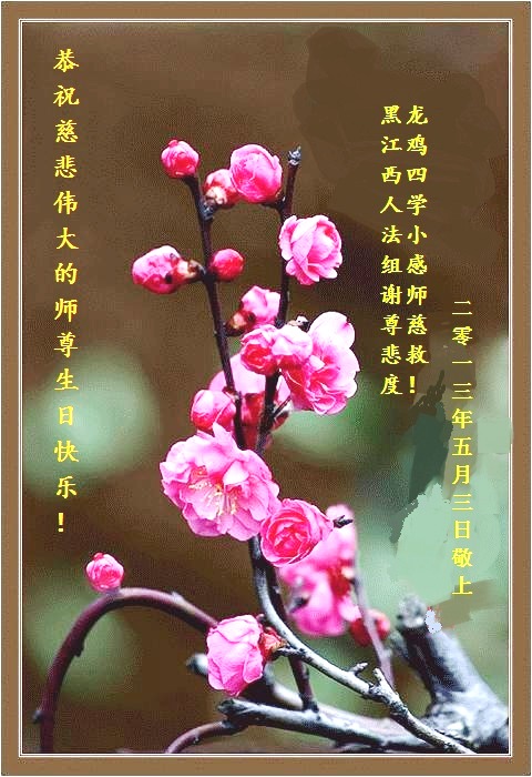 在这普天同庆的日子里,弟子一家人感恩师尊苦度。 虎林一家大法弟子 2013年5月10日 黑龙江省鸡西市某地区全体大法弟子敬上:恭贺师尊生日快乐!恭祝大法洪传二十一周年!