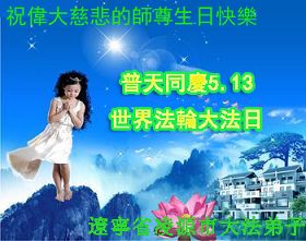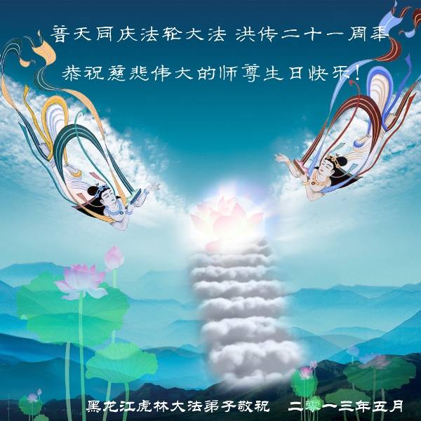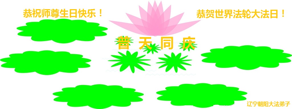 在这普天同庆的日子里,弟子们感恩师尊的慈悲救度,弟子们一定整体配合好,共同精進,紧跟师尊正法進程,做好三件事,修好自己,多救众生,兑现誓约,圆满随师还!全体弟子叩拜师尊:祝师尊生日快乐!感恩! 辽宁省朝阳市资料点大法弟子恭祝师尊生日快乐!传法二十一周年!暨普天同庆、同颂五一三世界法轮大法日!