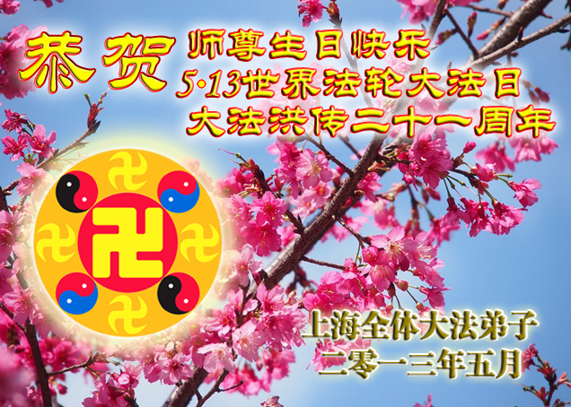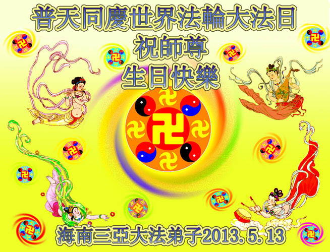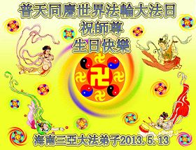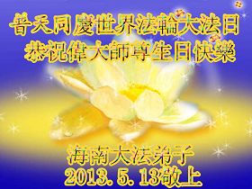 上海南汇大法弟子 二零一三年五月 海南省深圳市全体大法弟子恭祝师尊生日快乐!普天同庆同贺世界法轮大法日!