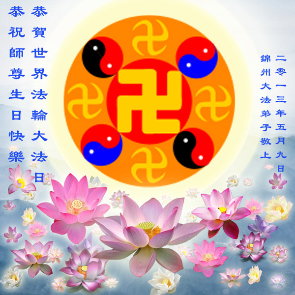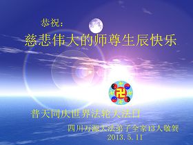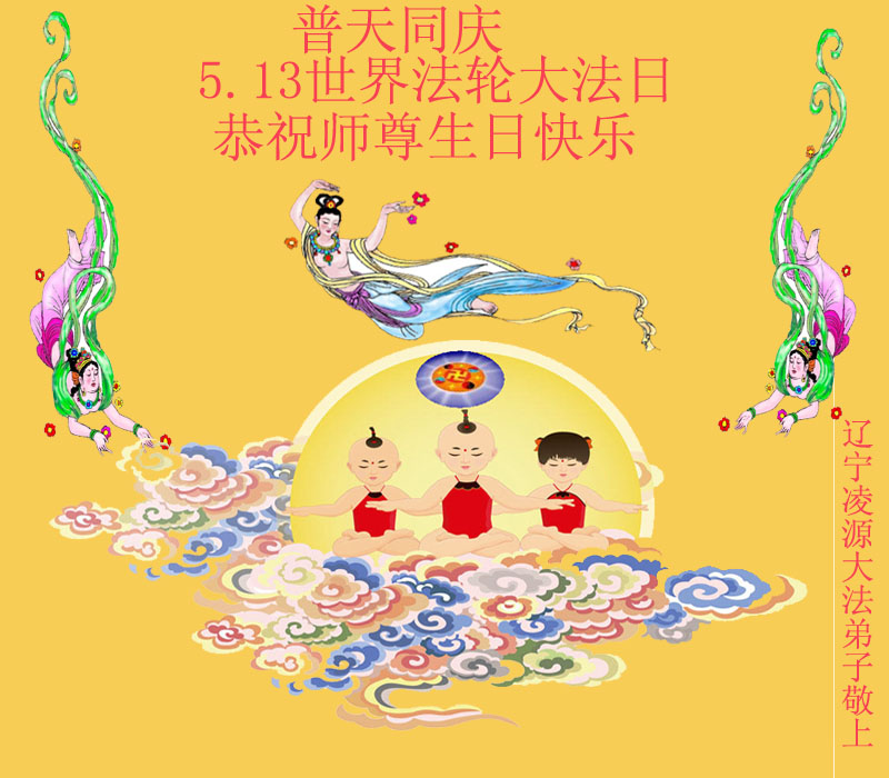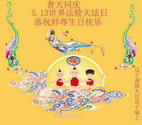在这普天同庆的时刻,弟子用尽人世间的语言也无法表达您的恩情。在您的慈悲呵护下我们走过来了,在大法中洗净再洗净,弟子一定扎扎实实做好三件事,再次叩拜师恩,师尊您辛苦了! 二零一三年五月十日 凌海农村大法弟子一学法小组 辽宁省锦州大法弟子恭祝师尊生日快乐!同贺5.13世界法轮大法日!