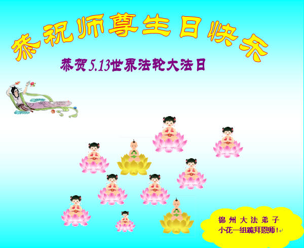 我们叩拜最伟大的师尊:您给予我们最最珍贵的大法、您给予我们许许多多甚至我们自己都不知道的一切;您为我们承受了数不尽的痛苦,您为我们开创了未来的世界。用尽人类的语言都无法表达我们对您的敬仰,竭尽众生的智慧也不知如何对您感恩。最伟大的主啊,竟然下到人间救度我们……。师父啊,在这伟大、光辉的日子里,我们向您献上我们最诚挚的心! 辽宁省锦州大法弟子恭祝伟大恩师生日快乐!