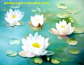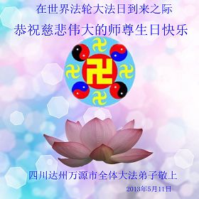 我是山东某县人民银行大法弟子,2006年2月真正得法,最早接触大法是7.20以前,因此对于大法是好的,是正法,没有任何障碍;不仅如此,法轮功是超出现代科学的真正科学,是属于全世界的,正如英国外交家、前英国驻爱尔兰大使福昂西斯爵士说:“法轮功不仅是属于中国的,这是一项全球性的新文明精神运动,她代表了人类的未来,法轮功的精神力量和道德勇气,很快会传播整个人类,并诞生出新的文明。” 每每想到伟大师尊为弟子、为世人、为众生的得救,几乎耗尽一切,我就会痛哭失声,任凭泪水冲刷身、心、灵的污垢。无法用人类的语言表达弟子对无量慈悲伟大师尊的感恩。得法得度,兑现史前誓约是弟子千万年的等待。在慈悲、无私、伟大师尊华诞暨世界法轮大法日之际,弟子唯愿我师生日快乐,安康永远,生命永远!普天同庆世界法轮大法日! 2013年05月11日 星期六 癸巳年四月初二日 西藏大法弟子恭祝师父生日快乐!庆祝法轮大法洪传二十一周年!